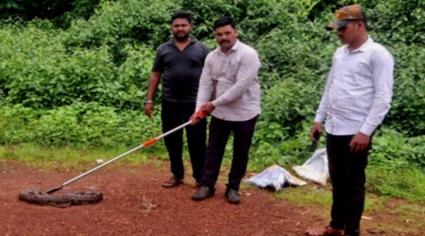 गुहागर तालुक्यातील पाटपन्हाळे गणेशवाडी परिसरात गुरुवारी सकाळी १० फूट लांब महाकाय अजगर आढळून आला. स्थानिक ग्रामस्थांनी तत्काळ सर्पमित्रांना माहिती दिल्यानंतर तातडीने घटनास्थळी धाव घेत अजगराला सुरक्षितरित्या पकडून नैसर्गिक अधिवासात सोडण्यात आले.