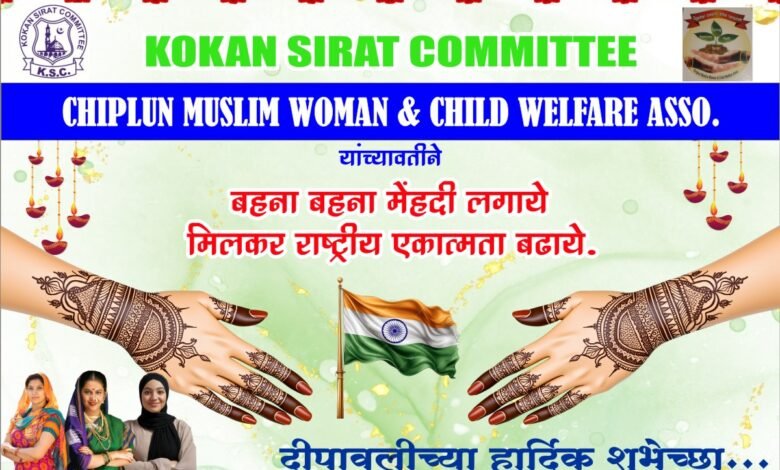 *कोकण सिरत कमिटी चिपळूण व चिपळूण मुस्लिम वूमन अँड चाईल्ड वेलफेअर यांच्या संयुक्त विद्यमाने राष्ट्रीय एकात्मता व सामाजिक एकता वाढावी या उद्देशाने दीपावलीच्या मुहूर्तावर रविवार दिनांक 19 ऑकटोबर रोजी सकाळी अकरा ते दुपारी तीन वाजेपर्यंत इंदिरा गांधी सांस्कृतिक केंद्र चिपळूण येथे आपल्या हिंदू भगिनींना मेहेंदी लावण्याचा कार्यक्रम आयोजित केलेला आहे.*