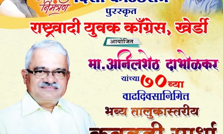 दिशा फाऊंडेशन पुरस्कृत राष्ट्रवादी युवक काँग्रेस,खेर्डी आयोजित खेर्डीतील प्रतिष्ठित व्यक्तीमत्व मा.श्री.अनिलशेठ दाभोळकर यांच्या 70 व्या वाढदिवसाचे औचित्य साधून सोमवार दि.30 मार्च 2026 ते बुधवार दि.01 एप्रिल 2026 दरम्यान खेर्डी बाजारपेठ येथे महाराष्ट्र राज्याचे माजी उपमुख्यमंत्री “कै.अजित दादा पवार क्रिडानगरी” मध्ये भव्य दिव्य अशा स्वरुपातील तालुकास्तरीय कबड्डी स्पर्धेचे आयोजन करण्यात आले आहे.